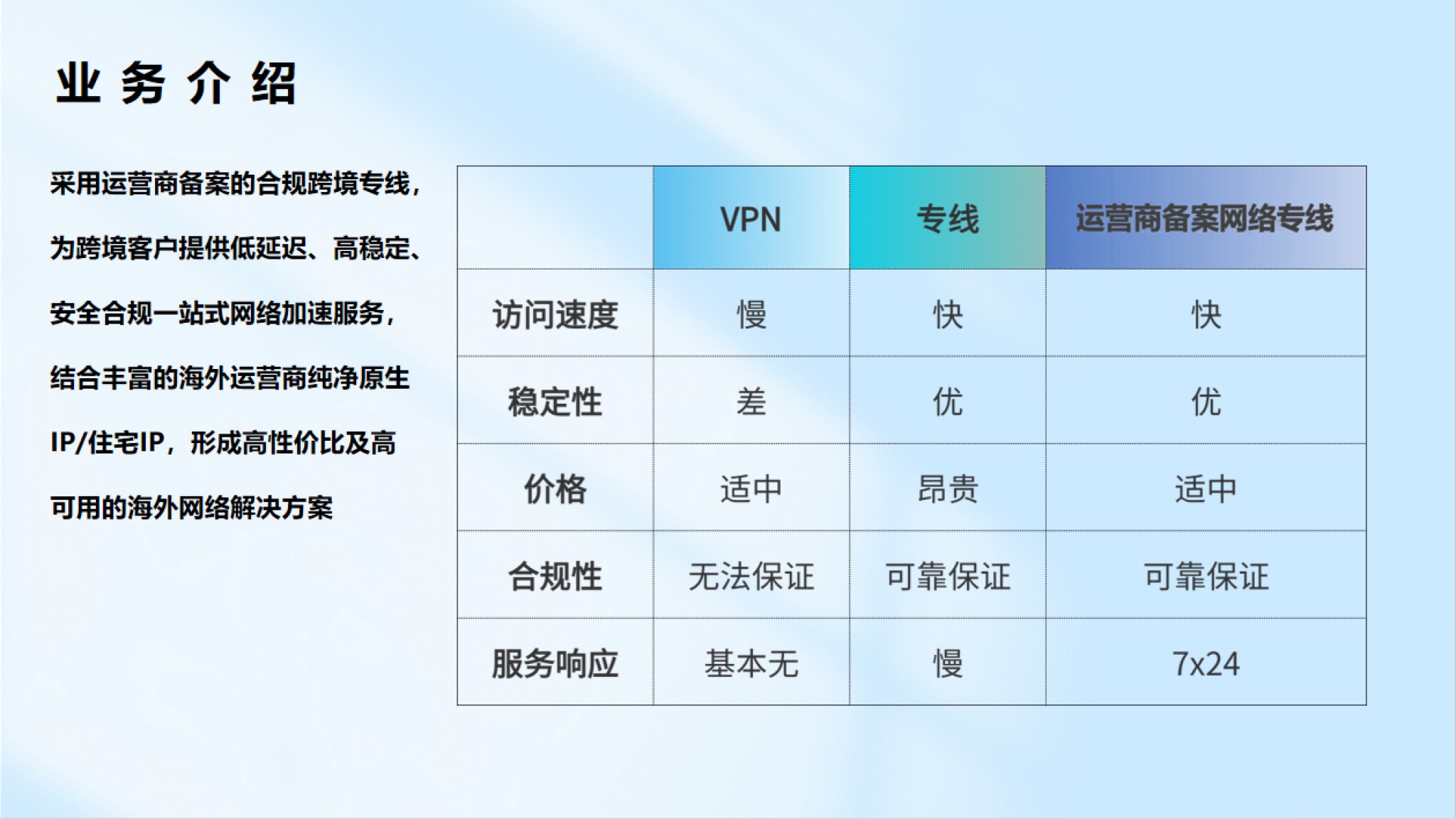 從線路申請、路由優化到維護,提供一站式專業服務,一對一解決問題,專業營銷團隊一對一定制服務